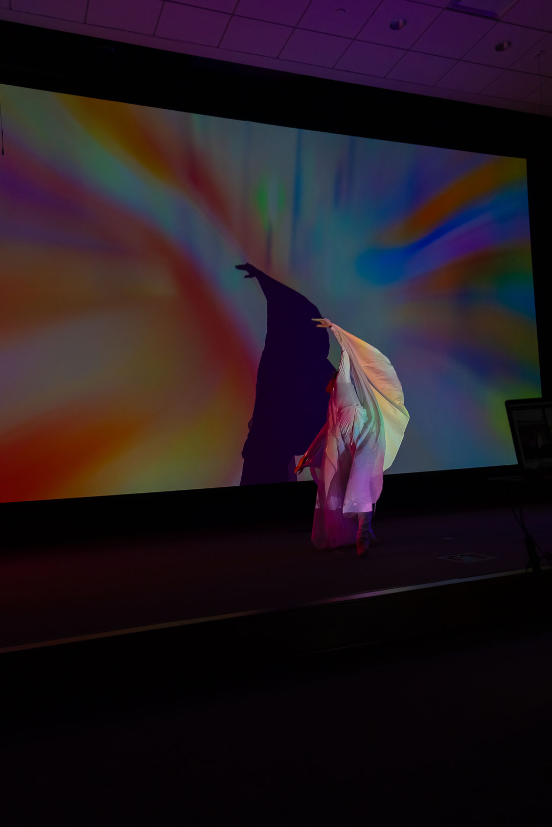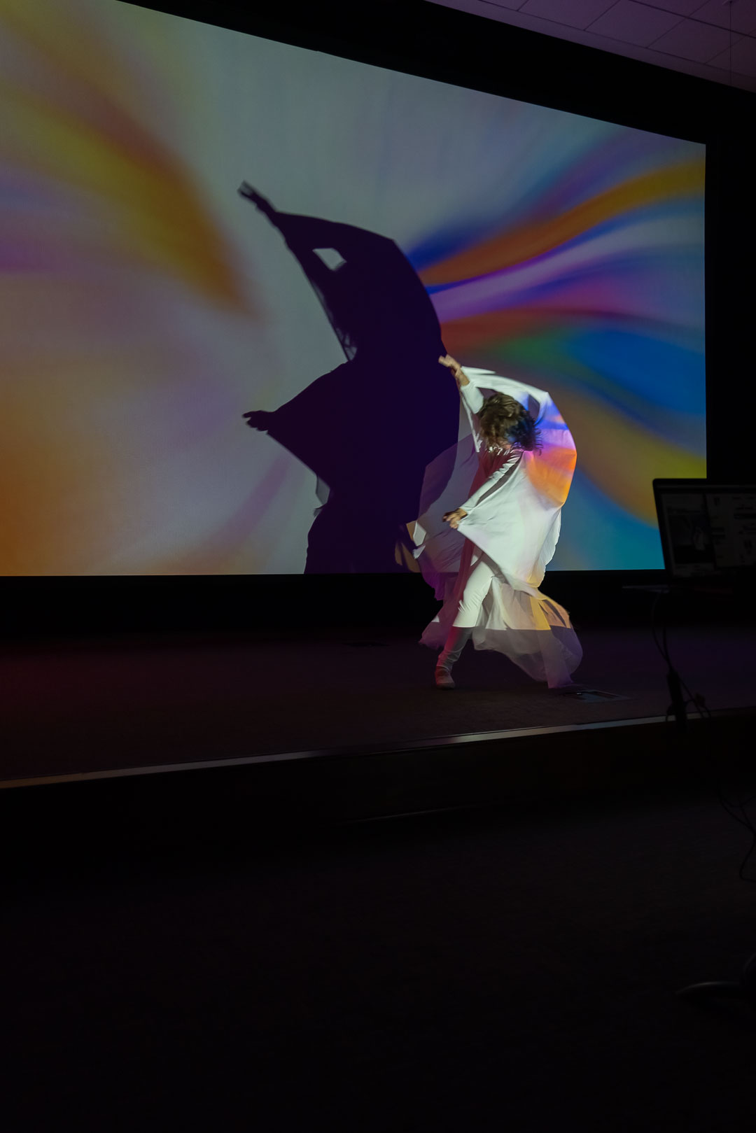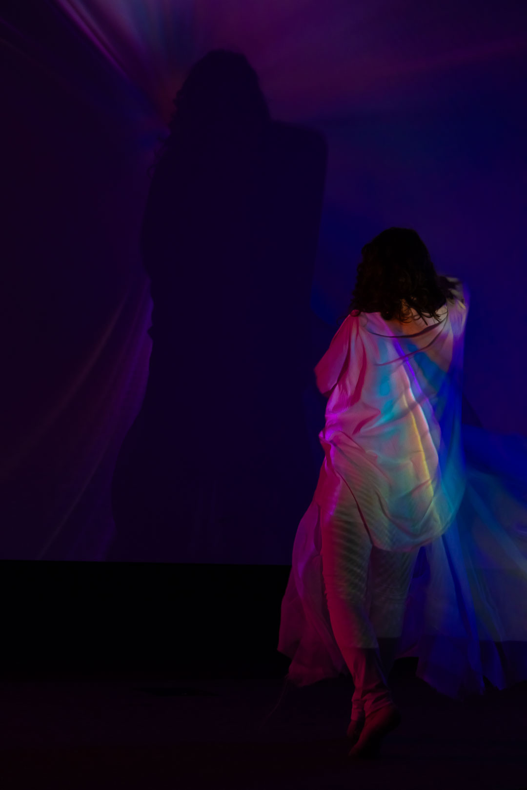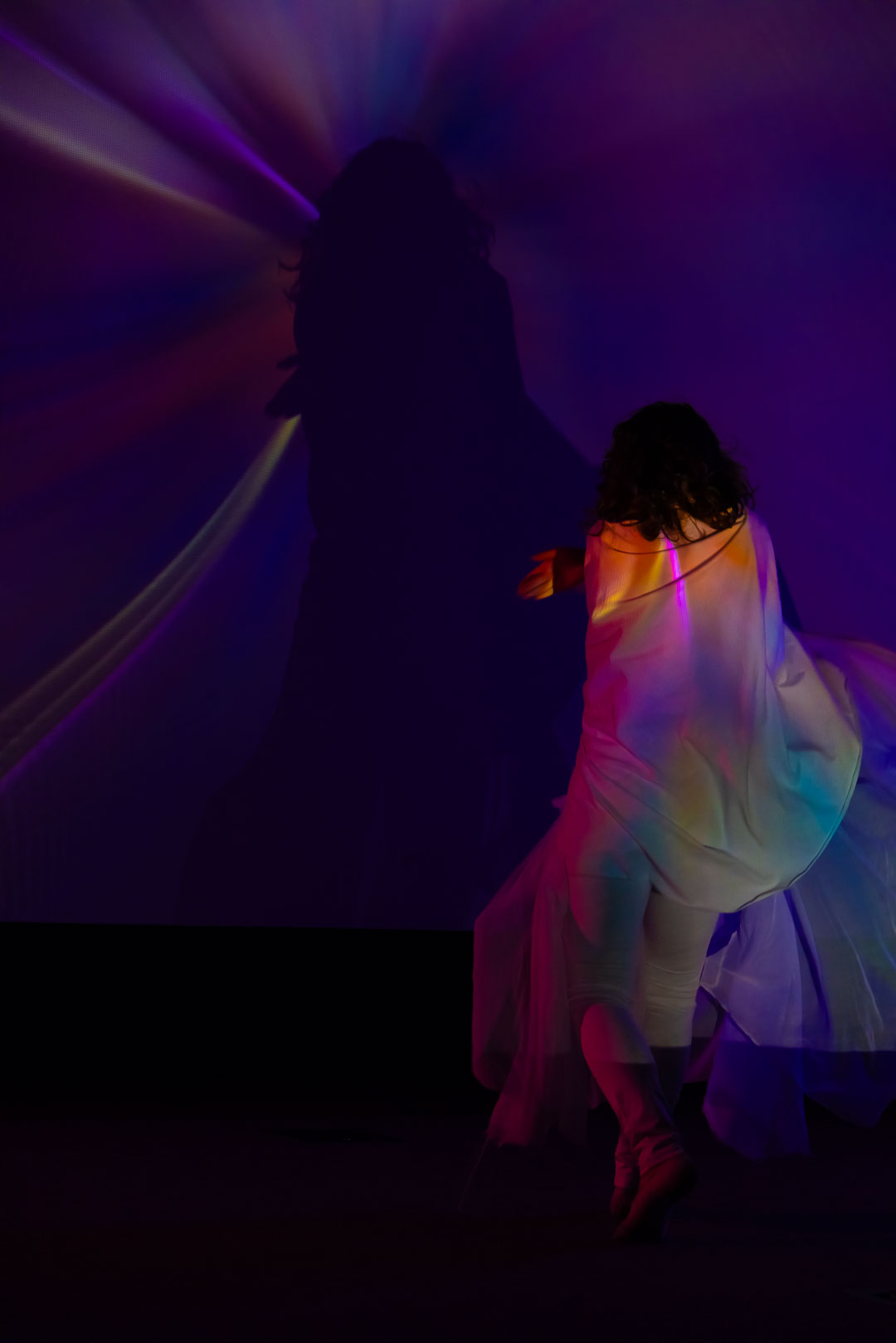 I had the privilege of serving as the composer, audio-visual designer, and director for Phantom of Utopia II: The Convergence, overseeing its development as an extended reality production in the XR Studio. This version featured a layered juxtaposition of real-time live camera feed and generative visual effects that responded dynamically to sound and movement. I was honored to collaborate with dancer Ava Heath, whose performance brought the piece’s physical poetry to life, and with Irina Kruchinina, whose light projection sequence offered a spectral counterpart to the corporeal presence—embodying an alternate, luminous manifestation of the dancer. Their contributions were vital in shaping the dual dimensions of embodiment and illusion at the heart of the work.