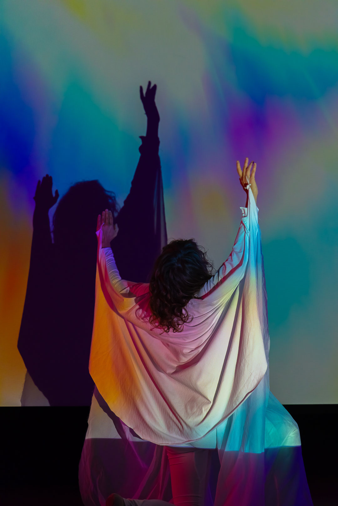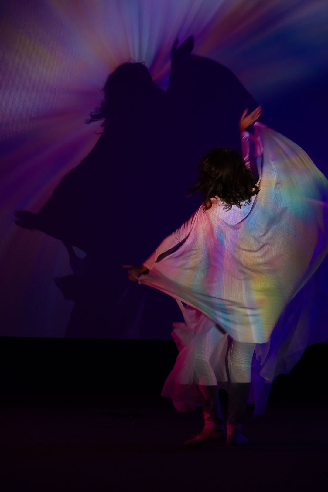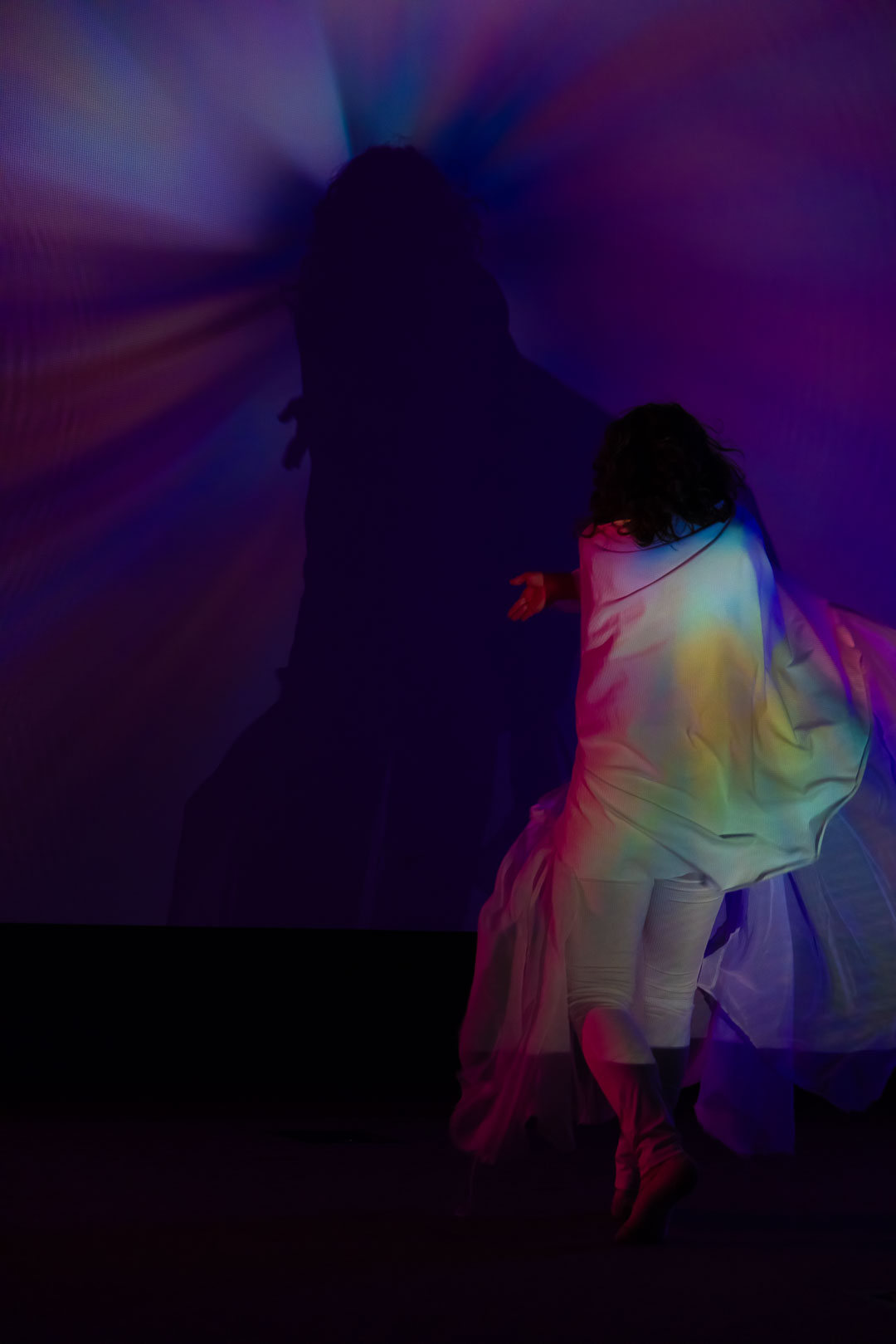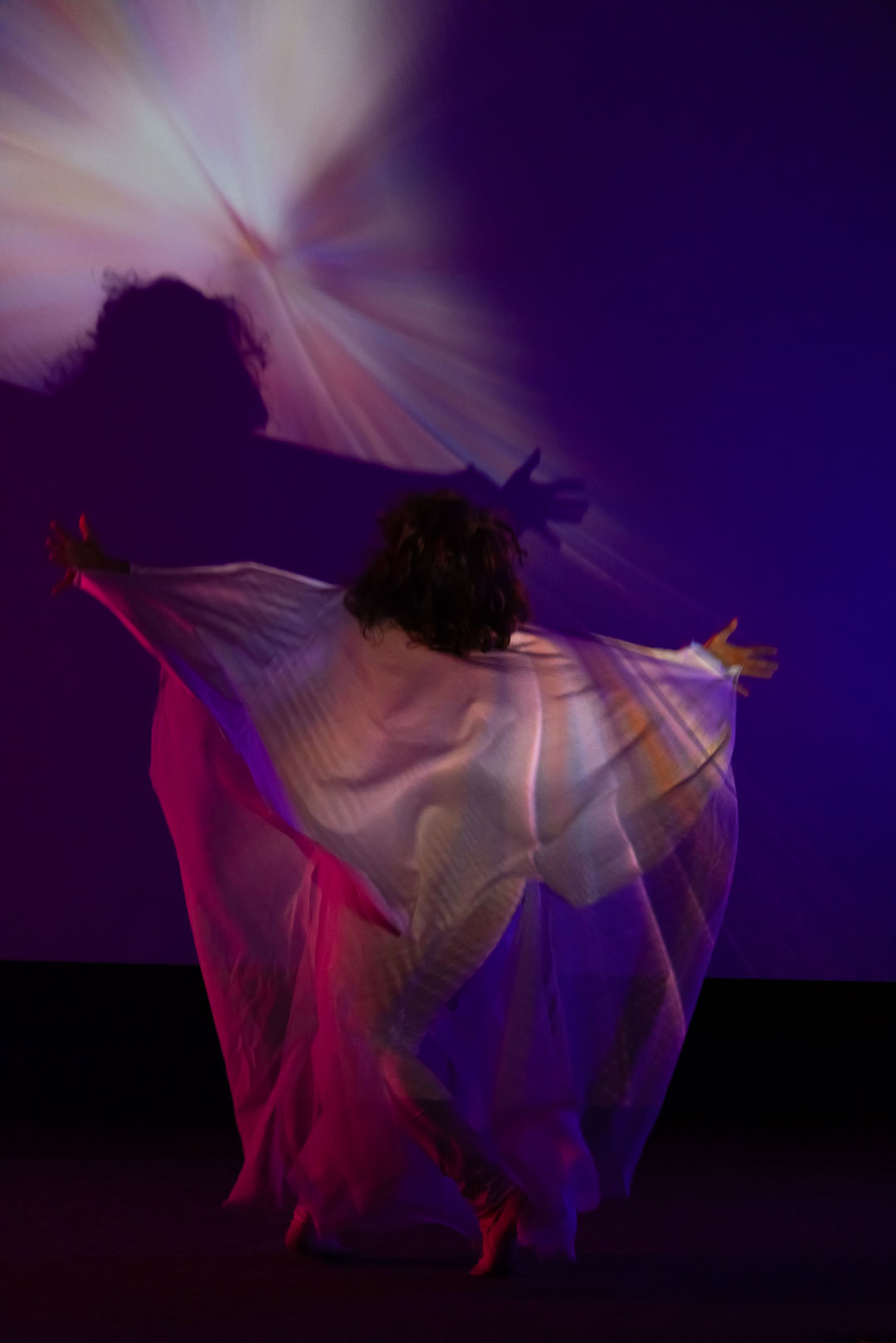 Fixed video projections and blurred live camera feeds merge and diverge throughout the performance, creating a visual poetry that responds intuitively to sound and movement. The dancer’s gestures, both deliberate and ephemeral, serve as ink strokes across an invisible page, animating a space where body, image, and voice are deeply entwined. Cantonese vocalizations, bending between pitches and drifting through quarter-tone glides, echo through the space like distant recollections of language and memory. Exhales and inhales become their own choreography, articulating wonder, disorientation, and longing.